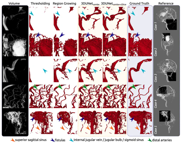 Segmentation of brain arterio-venous malformations (bAVMs) in 3D rotational angiographies (3DRA) is still an open problem in the literature, with high relevance for clinical practice. While deep learning models have been applied for segmenting the brain vasculature in these images, they have never been used in cases with bAVMs. This is likely caused by the difficulty to obtain sufficiently annotated data to train these approaches. In this paper we introduce a first deep learning model for blood vessel segmentation in 3DRA images of patients with bAVMs. To this end, we densely annotated 5 3DRA volumes of bAVM cases and used these to train two alternative 3DUNet-based architectures with different segmentation objectives. Our results show that the networks reach a comprehensive coverage of relevant structures for bAVM analysis, much better than what is obtained using standard methods. This is promising for achieving a better topological and morphological characterisation of the bAVM structures of interest. Furthermore, the models have the ability to segment venous structures even when missing in the ground truth labelling, which is relevant for planning interventional treatments. Ultimately, these results could be used as more reliable first initial guesses, alleviating the cumbersome task of creating manual labels.